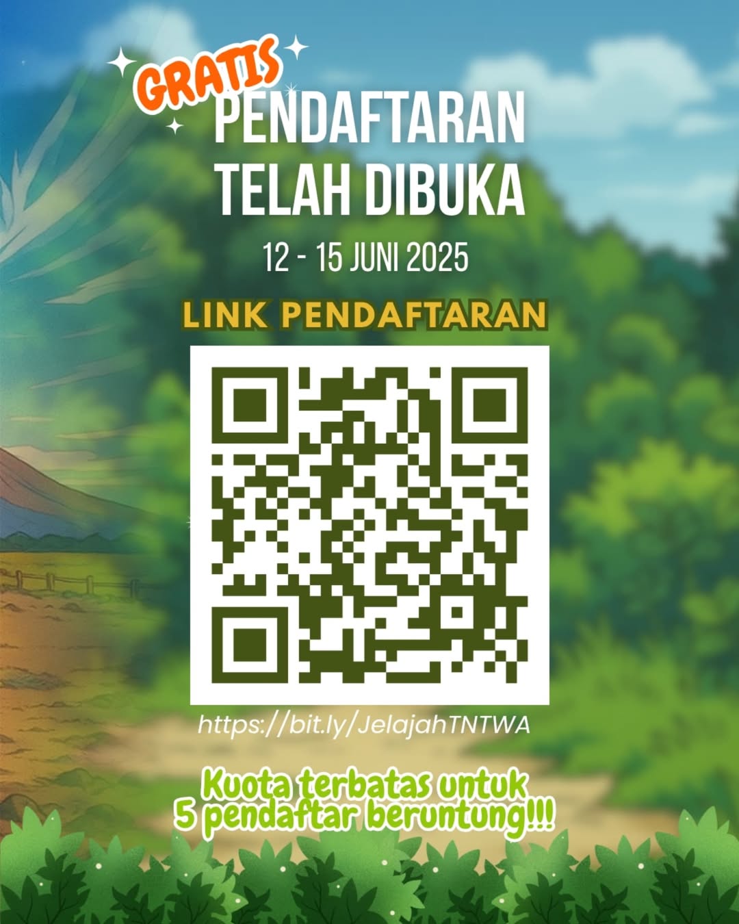 TELAH DIBUKAPendaftaran: 12 – 15 Juni 2025Hai Conservationmate,Saatnya menjelajah “Africa van Java” dan menikmati alam liar yang memukau! 🐃🌾Pendaftaran sesi 1 resmi dibuka — jangan sampai kehabisan slot, karena kuotanya terbatas ya...📍 Taman Nasional Baluran🎒 Kuota terbatas!Share juga ke teman yang butuh petualangan asli-asli, bukan healing ke mall doang 😜 Read More